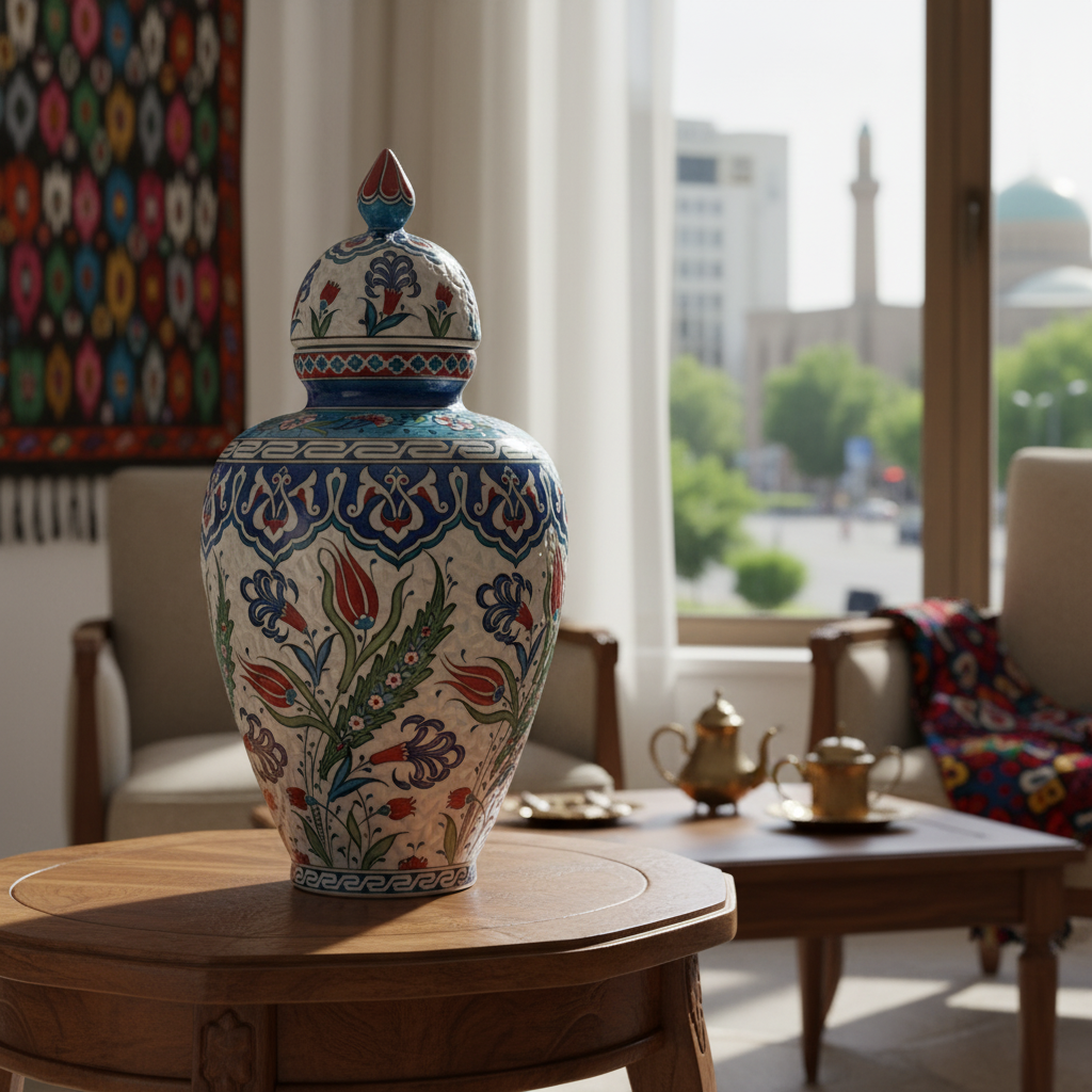 This Handmade Ceramic Vizier Jar is designed for those who appreciate fine craftsmanship. Standing at 30 cm, it is a piece that demands to be touched as much as admired.